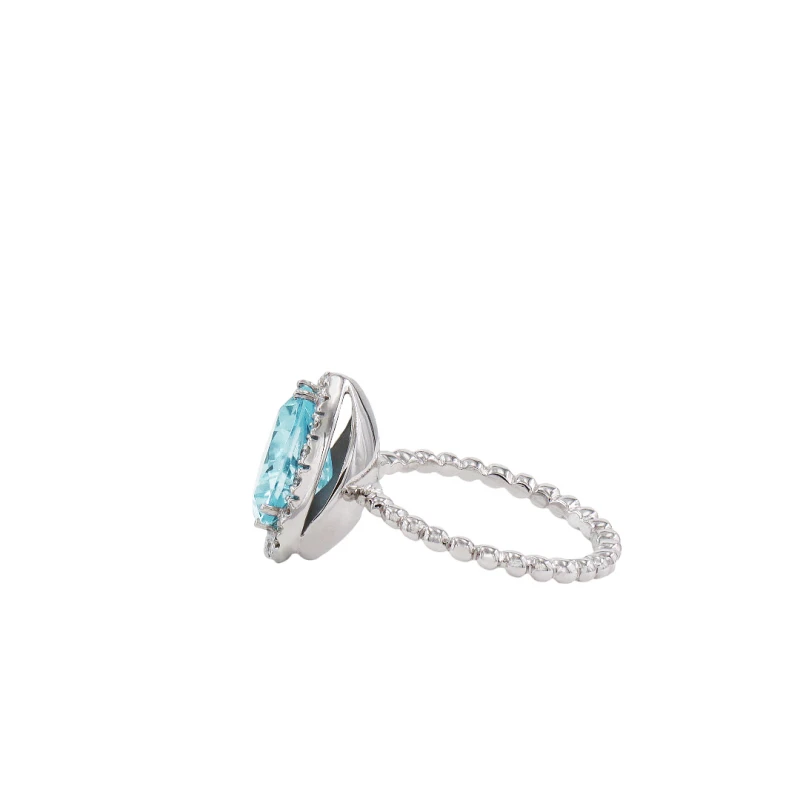 Marque uma presença exuberante com este anel feminino de joalharia em ouro branco de 19.2kl, uma joia prateada que se destaca com o seu topo de formato triangular, onde repousa um topázio azul de tonalidade clara e luminosa. Transmitindo uma aura serena com um brilho suave e límpido, a sua forma é realçada por um contorno de diamantes incolores cravados que acrescentam uma composição luminosa sofisticada ao visual de uma mulher. Uma joia que alia um design original à intemporalidade dos materiais, criando uma estética distinta com subtileza e um brilho envolvente.