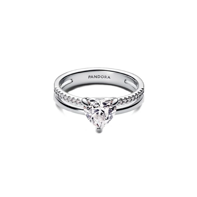 Elegante anel feminino da coleção Timeless da Pandora, um modelo de coloração em prateado trabalhado em prata de lei 925. Desenhado em duplo aro, um com um acabamento polido e outro composto por uma radiante composição de pequenas zircónias, evocam uma estética com um toque de brilho sereno que se combina elegantemente com a pedra recortada em forma de coração no topo da joia. Um modelo que expõe uma sensação apaixonante com um visual envolvente e luminoso.
