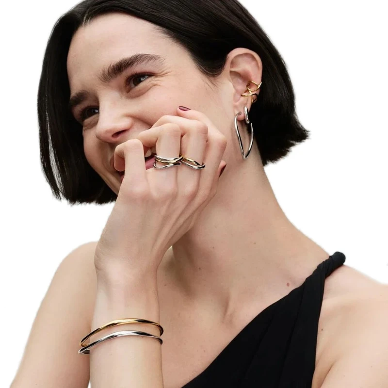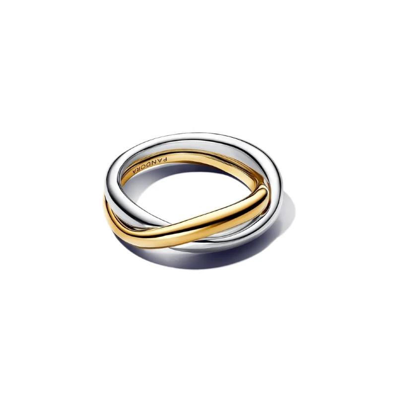 Elegantes anéis Pandora da linha Essence, elaborados numa liga única de metais e em prata de lei 925. Com o intuito de elevar o look de uma mulher, o design de dois aros entrelaçados ondulam-se em linhas sinuosas, que resultam numa sensação de movimento infinito, aliando-se a uma coloração brilhante bicolorida em prateado e dourado. Um destaque refinado com elegância, como complemento versátil extra para a coleção de joias femininas.