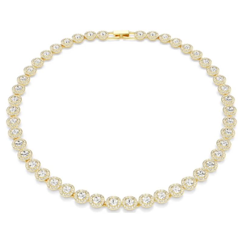Deslumbre-se com o brilho deste magnífico colar que capta um visual de sofisticação intemporal. O design dourado apresenta um contorno completo de cristais de lapidação redonda grandes. Uma forma perfeita de acentuar o glamour quando estiliza na transição do dia para a noite.