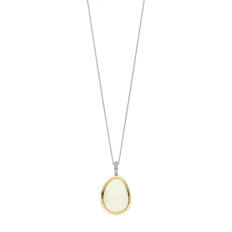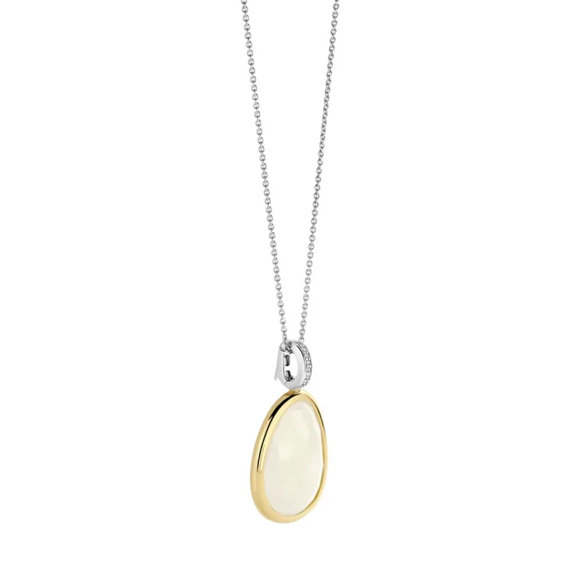 Elegante colar feminino Ti Sento em prata de lei 925 com um pendente com zircónias incolores e uma forma oval dourada suspensa. Com uma moldura de design irregular, a peça envolve delicadamente uma madrepérolaque irradia uma luz suave evocando um toque subtil à joia. Uma peça marcante que se acomoda com graciosidade no visual de uma mulher.