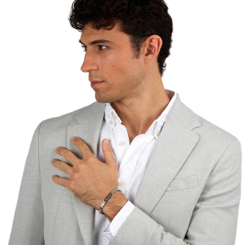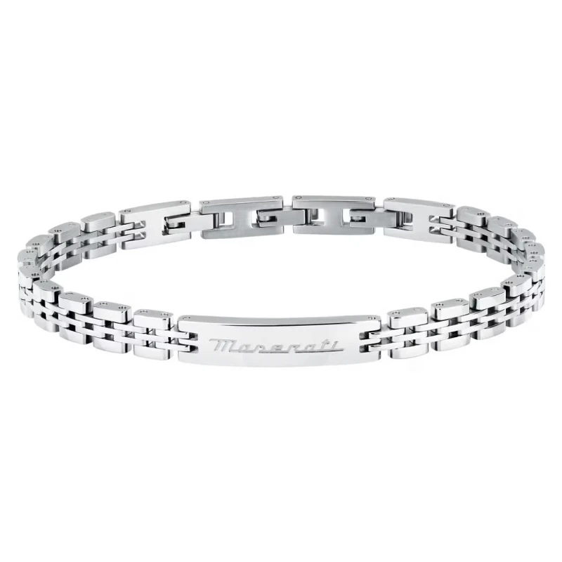 Pulseira Maserati para homem, um modelo elegante em aço inoxidável prateado que carrega um design moderno com um toque desportivo. Composto por uma chapa alongada que destaca o nome da marca para uma presença marcante e ousada, este acessório retrata a perfeição da técnica e a atenção aos pormenores de luxo que a Maserati dedica a todos os carros que produz, refletem-se nas suas joias com classe e requinte.