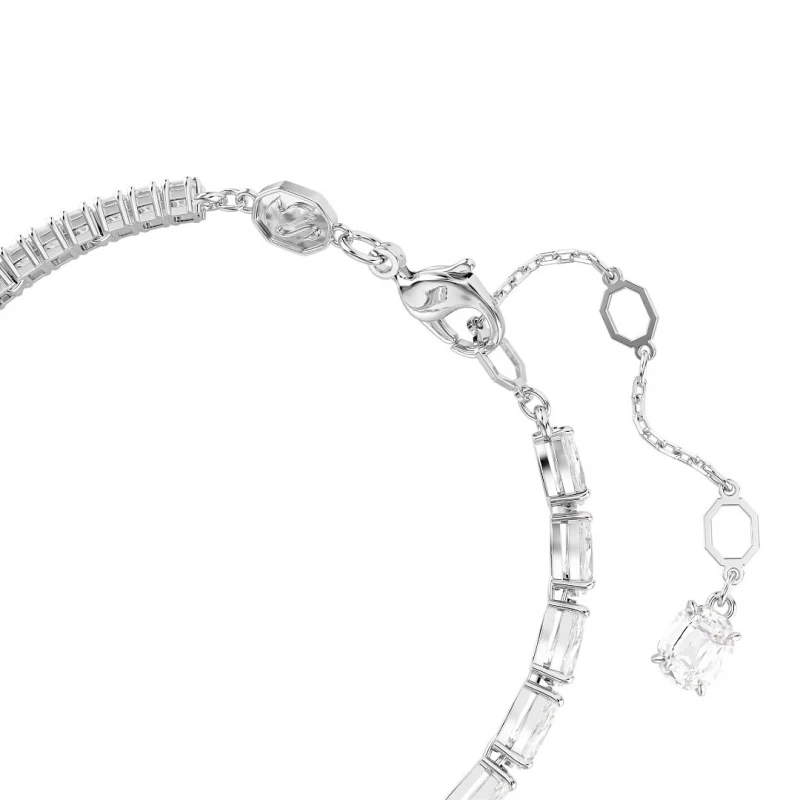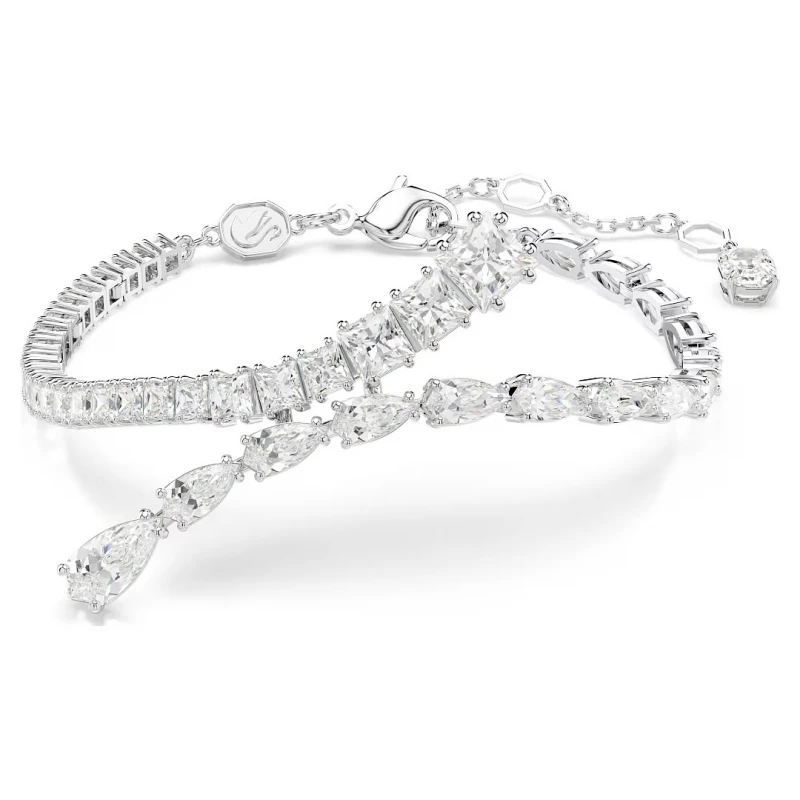 Radiante pulseiras de mulher da Swarovski Matrix, uma joia banhada a ródio sobre o aço prateado habilmente adornada por uma sequência de cristais de diferentes lapidações. Expondo um efeito dimensional singular, a joia apresenta uma malha sem fim envolvendo-se do lado oposto do fecho ajustável, combinando um sensação estética sofisticada e um design moderno delicado.